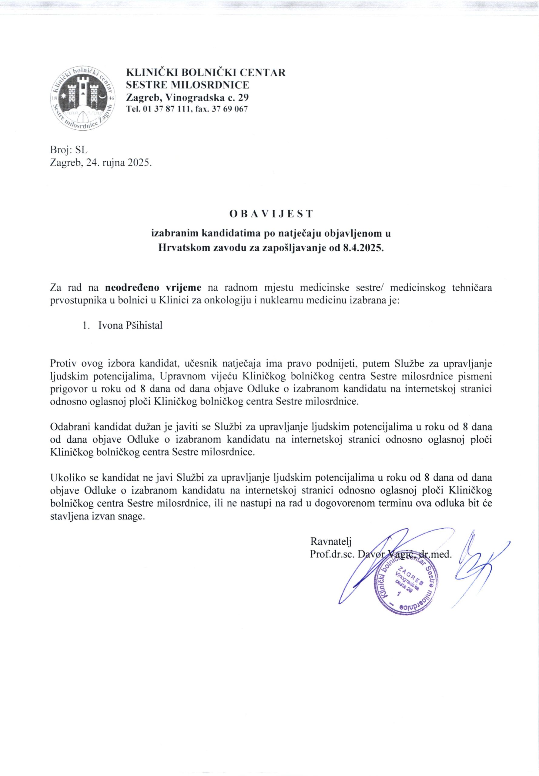 Odluka – med.sestra/ med.tehničar prvostupnik u bolnici – obj. 30.9.2025.