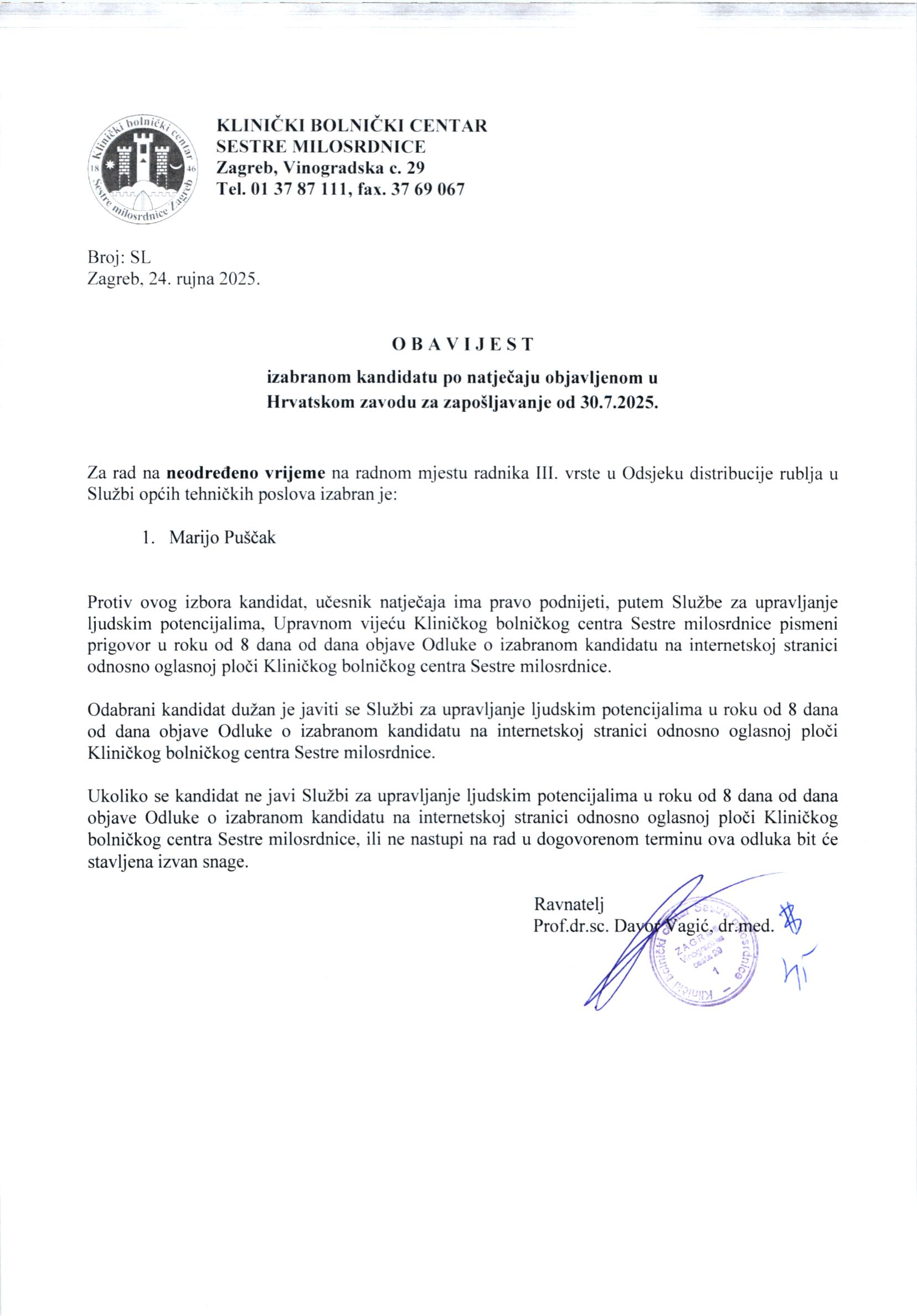 Odluka – radnik III. vrste u Odsjeku distribucije rublja – obj. 14.10.2025.