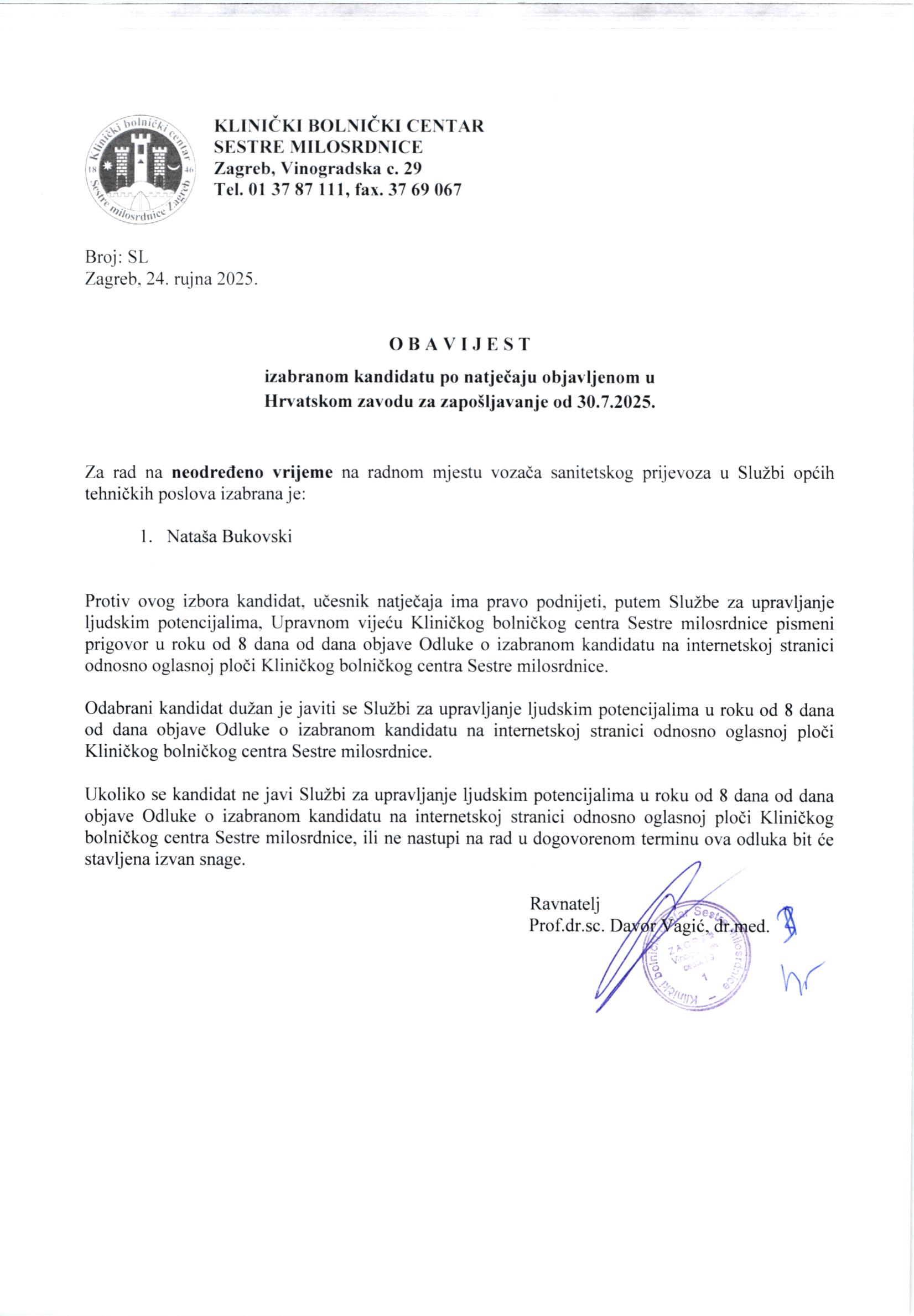 Odluka – vozač sanitetskog prijevoza – obj. 14.10.2025.