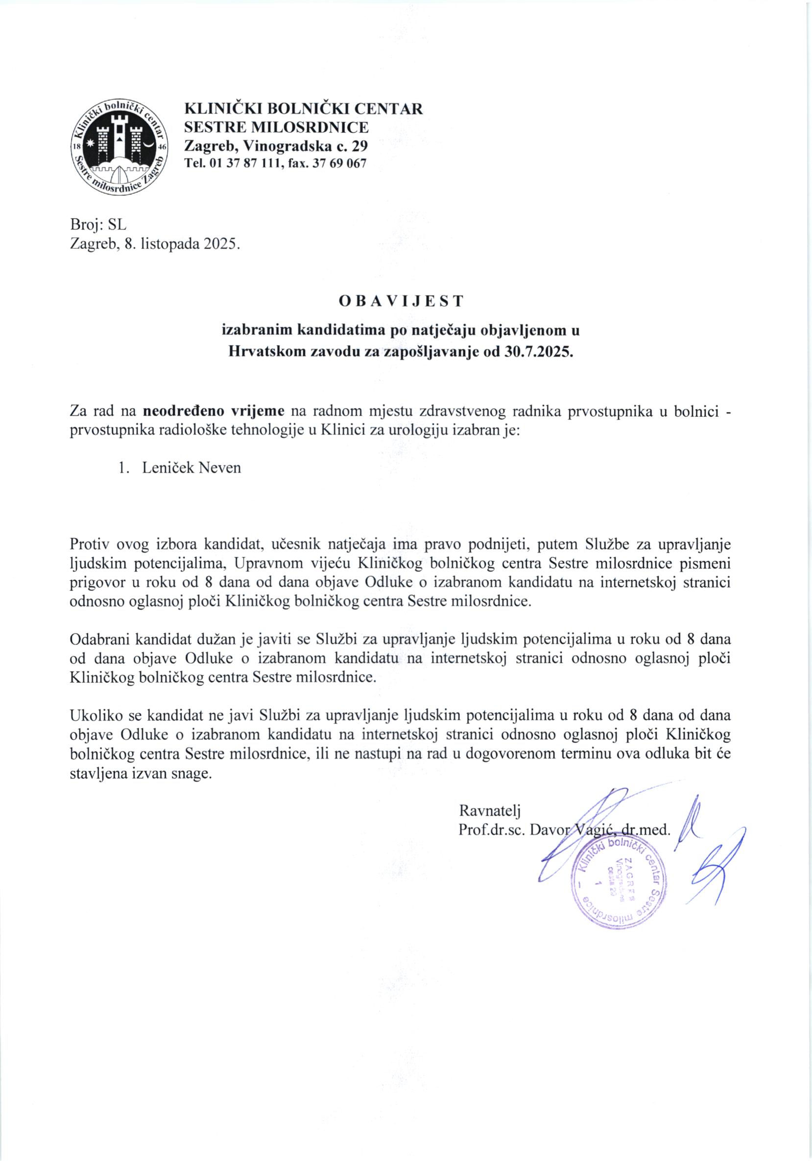 Odluka – zdr.radnik prvostupnik u bolnici – prvostupnik radiološke tehn. u Klinici za urologiju – obj. 20.10.2025.