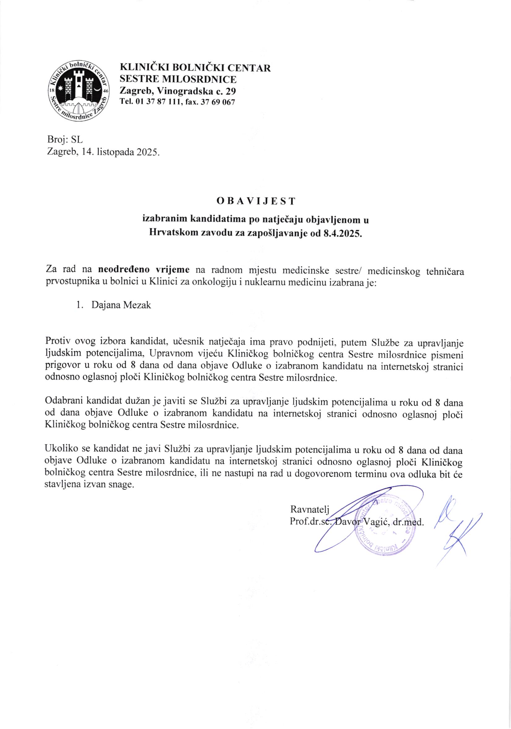 Odluka – medicinske sestra/ medicinski tehničar prvostupnik u bolnici u Klinici za onkologiju i nuklearnu medicinu – obj. 30.10.2025.