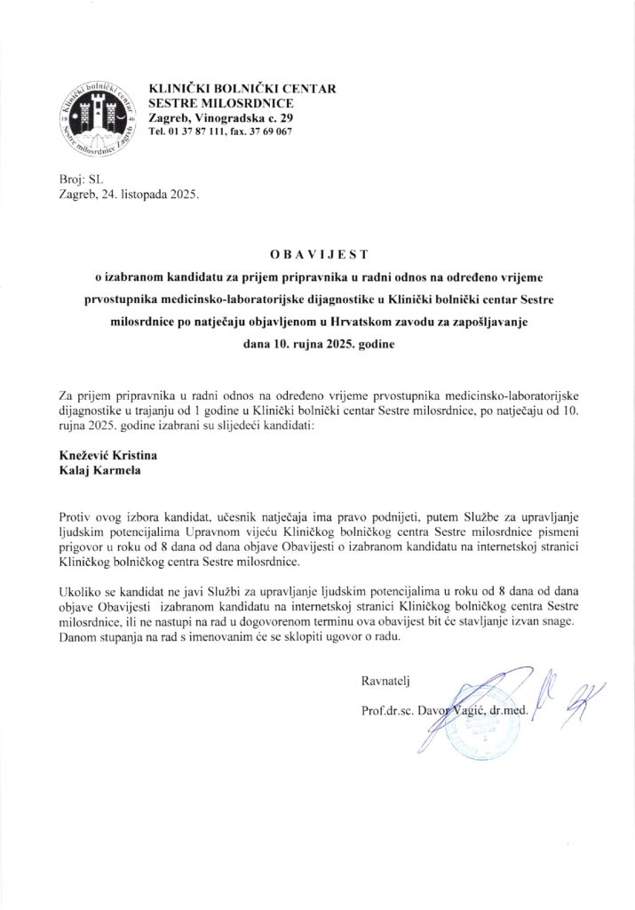 Odluka o odabranom kandidatu – prvostupnik/prvostupnica medicinsko-laboratorijske dijagnostike – pripravnik/pripravnica – obj. 31.10.2025.