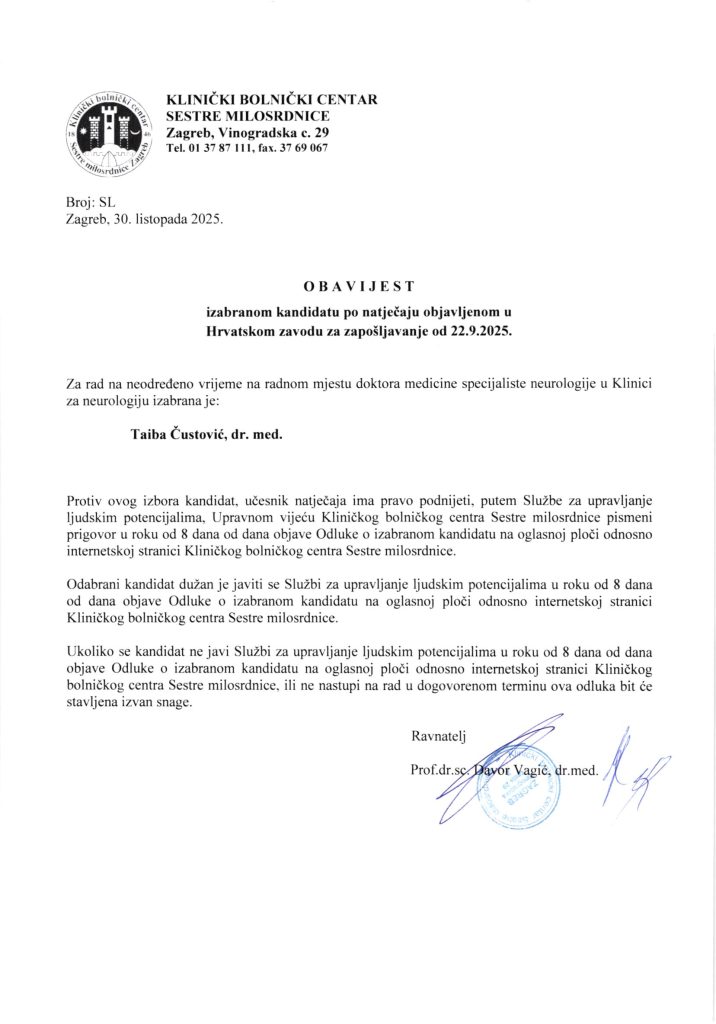 Obavijest o izabranom kandidatu – dr. med. specijalist neruologije u Klinici za neurologiju – obj. 4.11.2025.
