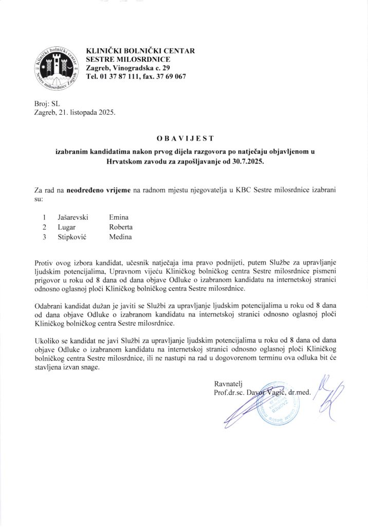 Obavijest o izabranom kandidatu – njegovatelj – obj. 4.11.2025.