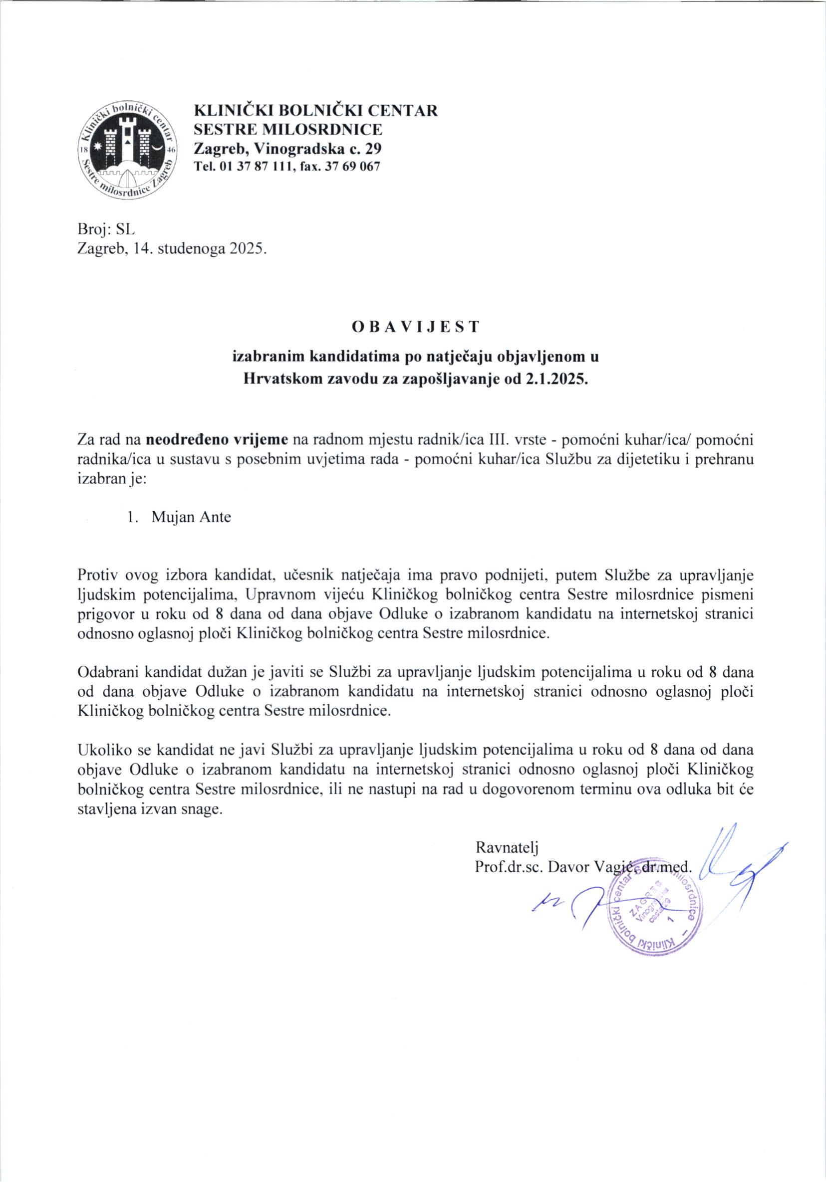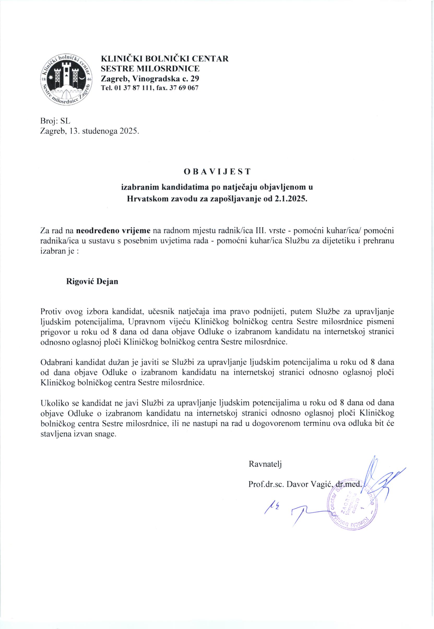 Odluka – radnik/ica III. vrste – pomoćni kuhar/ica/ pomoćni radnika/ica u sustavu s posebnim uvjetima rada – pomoćni kuhar/ica – obj. 25.11.2025.