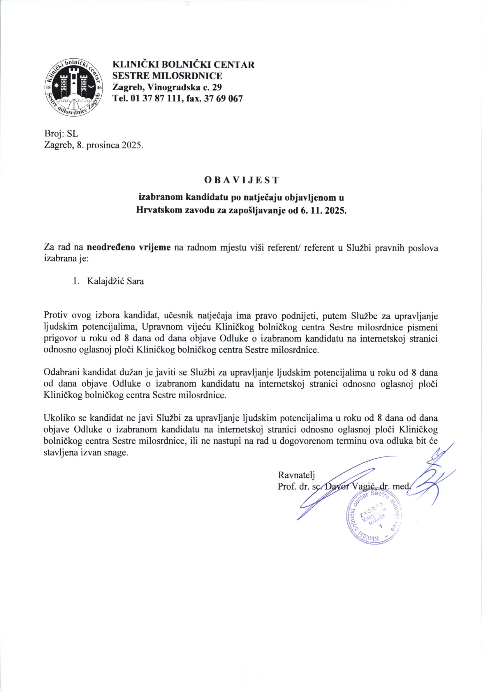Odluka – viši referent/ referent u Službi pravnih poslova – obj. 10.12.2025.