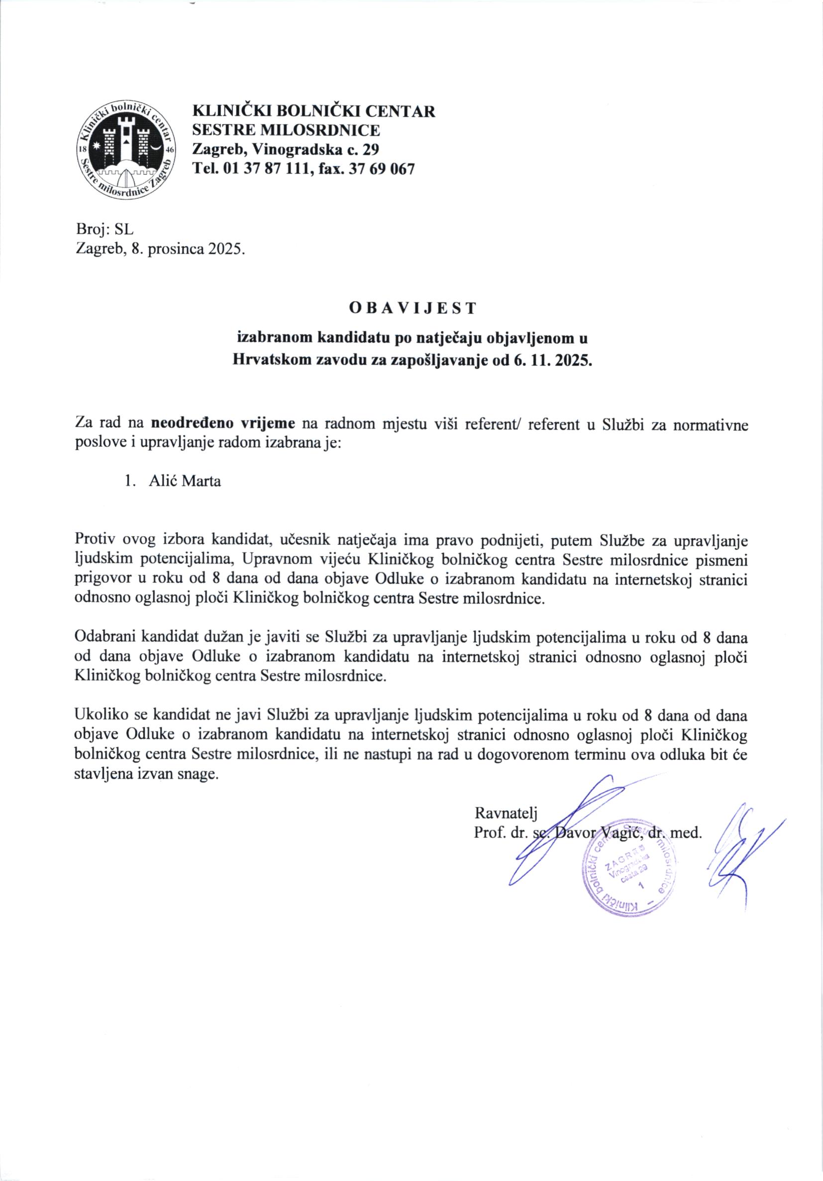 Odluka – viši referent/ referent u Službi za normativne poslove i upravljanje – obj. 10.12.2025.