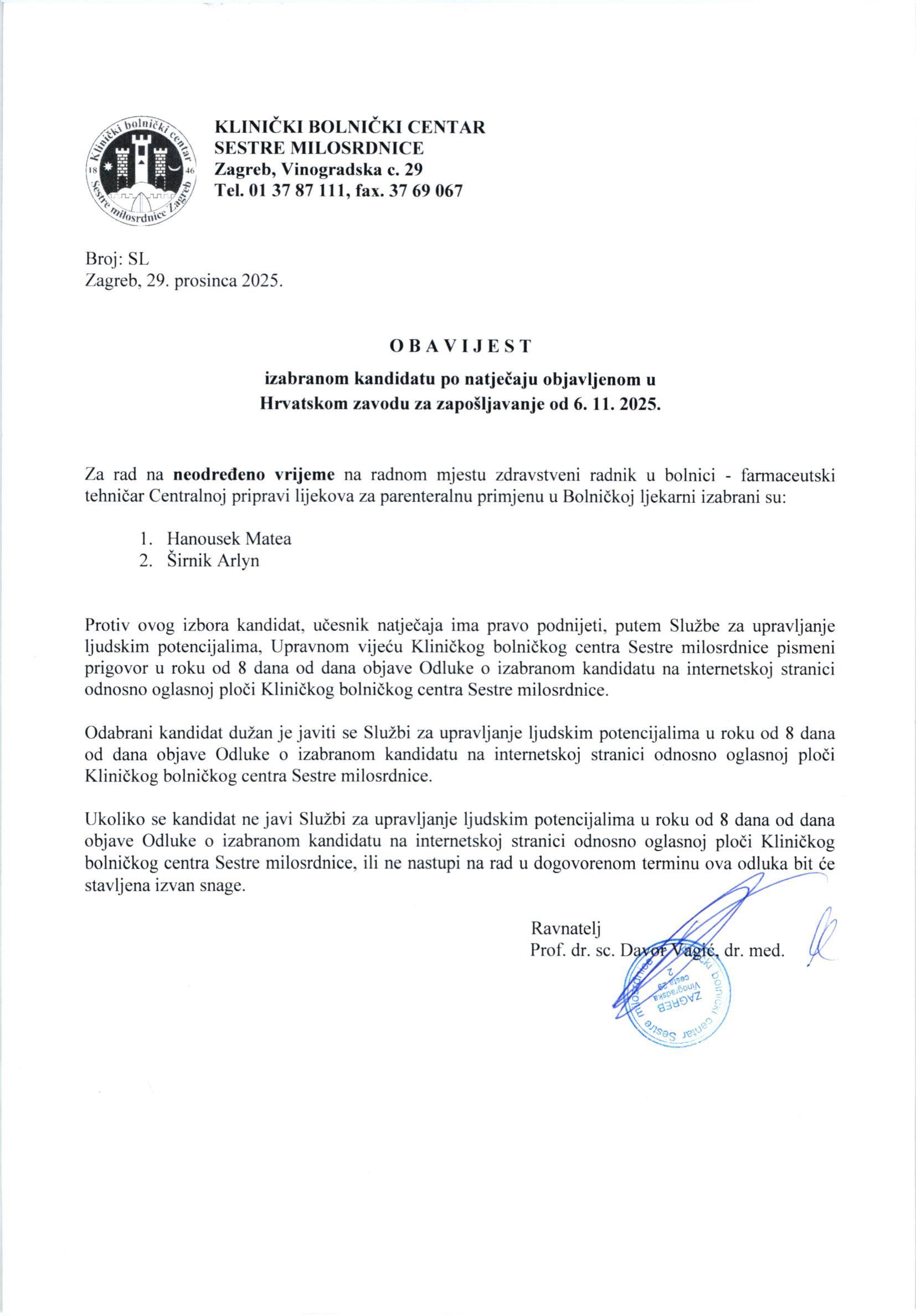 Odluka – zdr.radnik u bolnici – farm.tehničar u Centralnoj pripravi lijekova za parenteralnu primjenu – obj. 31.12.2025.