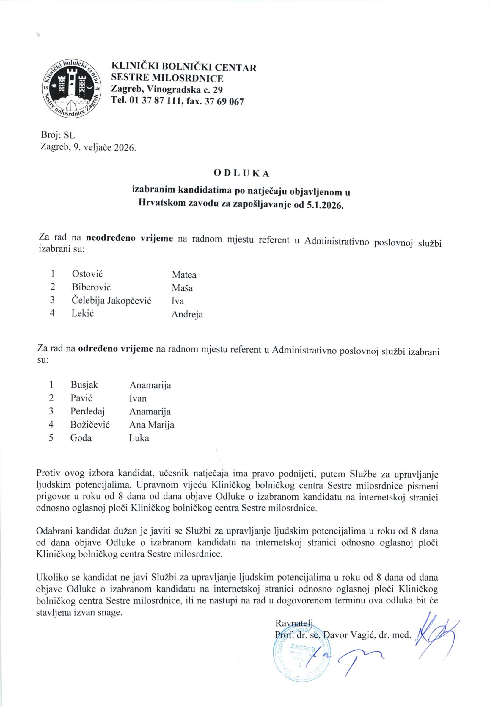 Odluka – referent u Administrativno poslovnoj službi – obj. 19.2.2026.