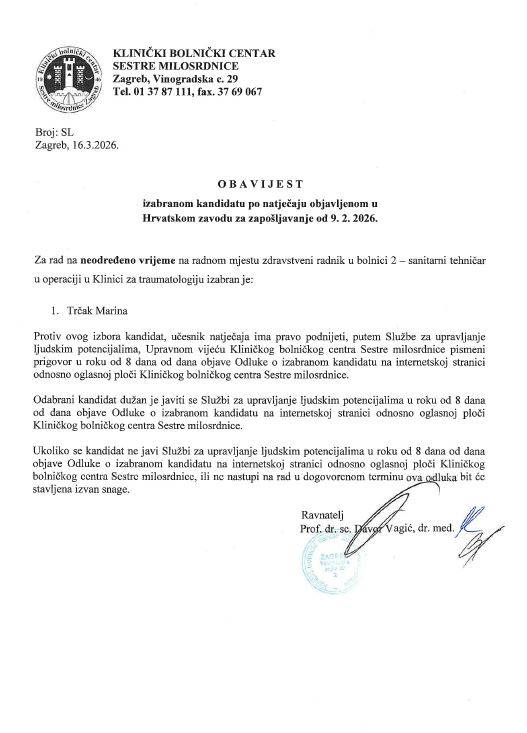 Odluka – sanitarni tehničar u operaciji u Klinici za traumatologiju – obj. 19.3.2026.