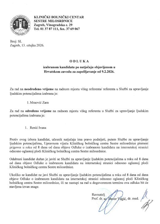 Odluka – viši referent/referent u Službi za upravljanje ljudskim potencijalima – obj. 19.3.2026.