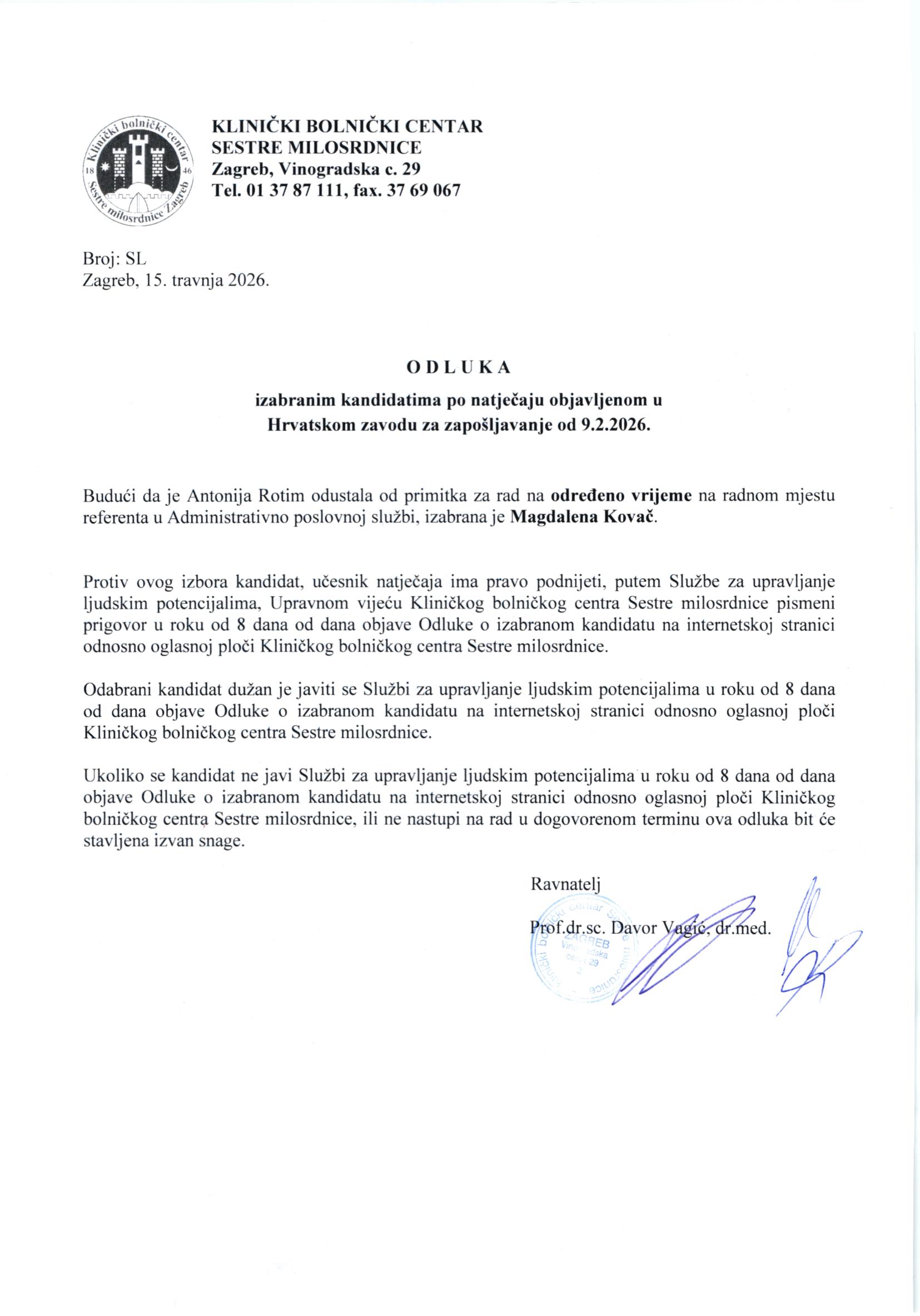 Odluka – referent u Administrativno poslovnoj službi – obj. 27.4.2026.